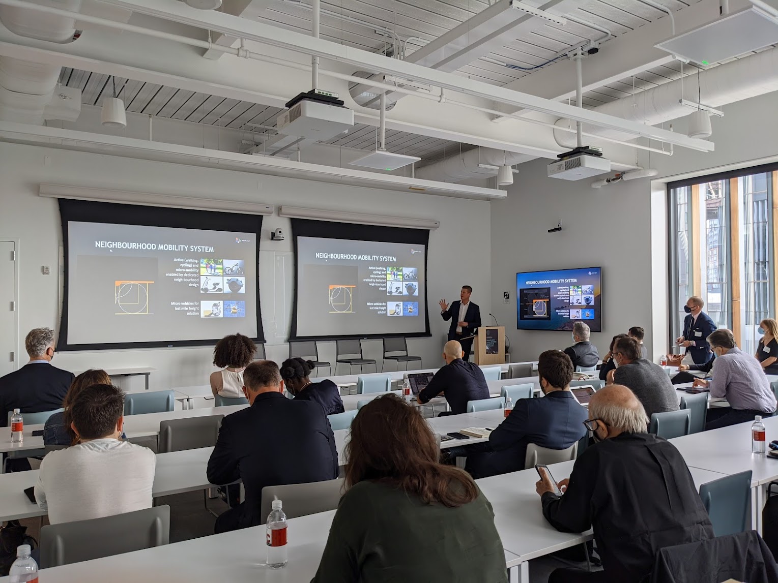 The session began with a keynote address by Canadian-American transportation planner Adam Giambrone, who ran projects in Toronto, New York, and Riyadh before joining the Saudi greenfield city project NEOM as its Director of Regional and Urban Mobility. In his opening remarks, Giambrone paid particular attention to The Line — an audacious plan to create a 140 kilometer-long urban corridor combining high-speed transit strung with local nodes of “five-minute cities” along its trunk.